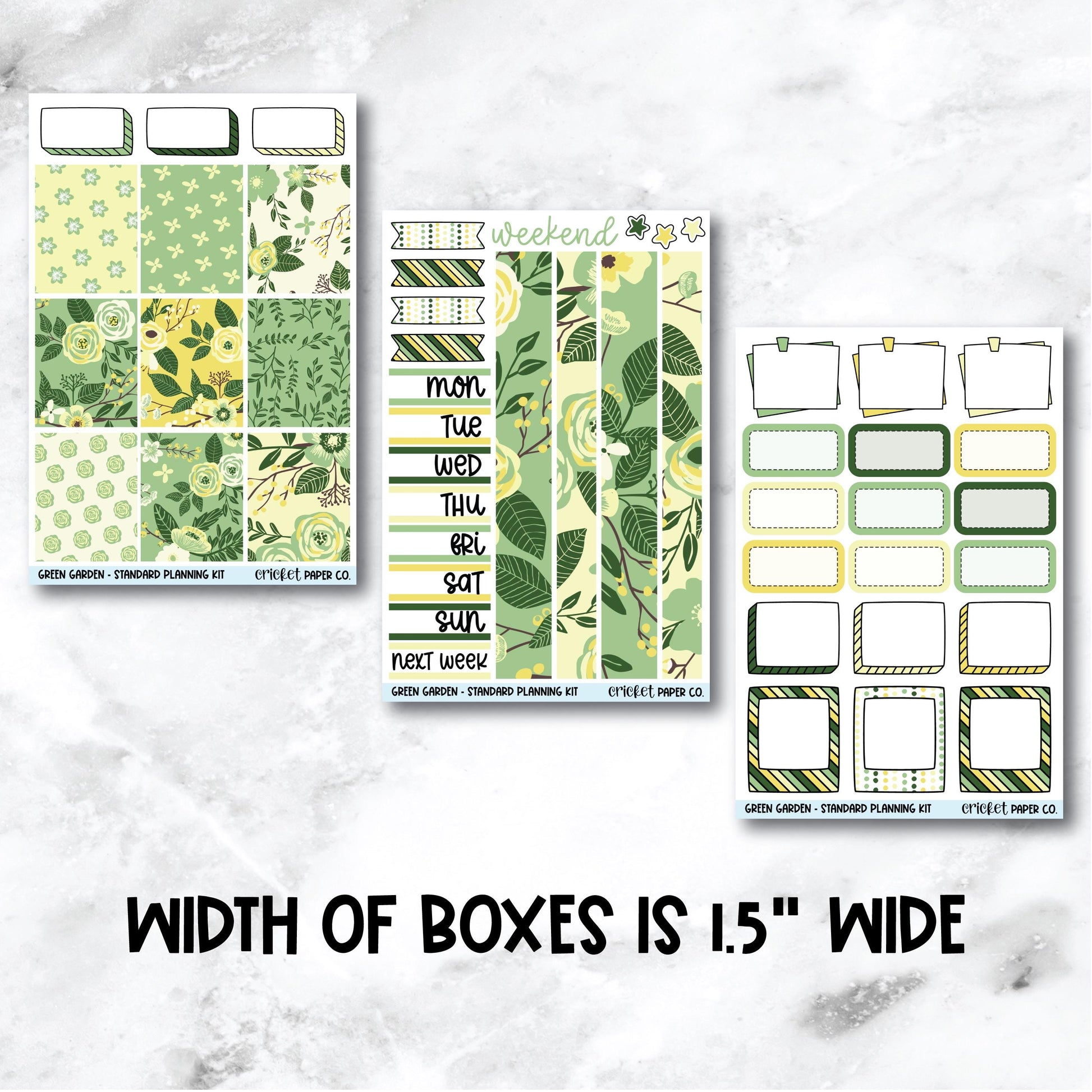 This listing is for a 3 sheet mini kit sized using standard vertical measurements intended for one week of planning. The full boxes are approximately 1.5" wide and 1.9" tall. The date covers and boxes are 1.5" wide. Washi can be hand trimmed to fit whatever spread you need.