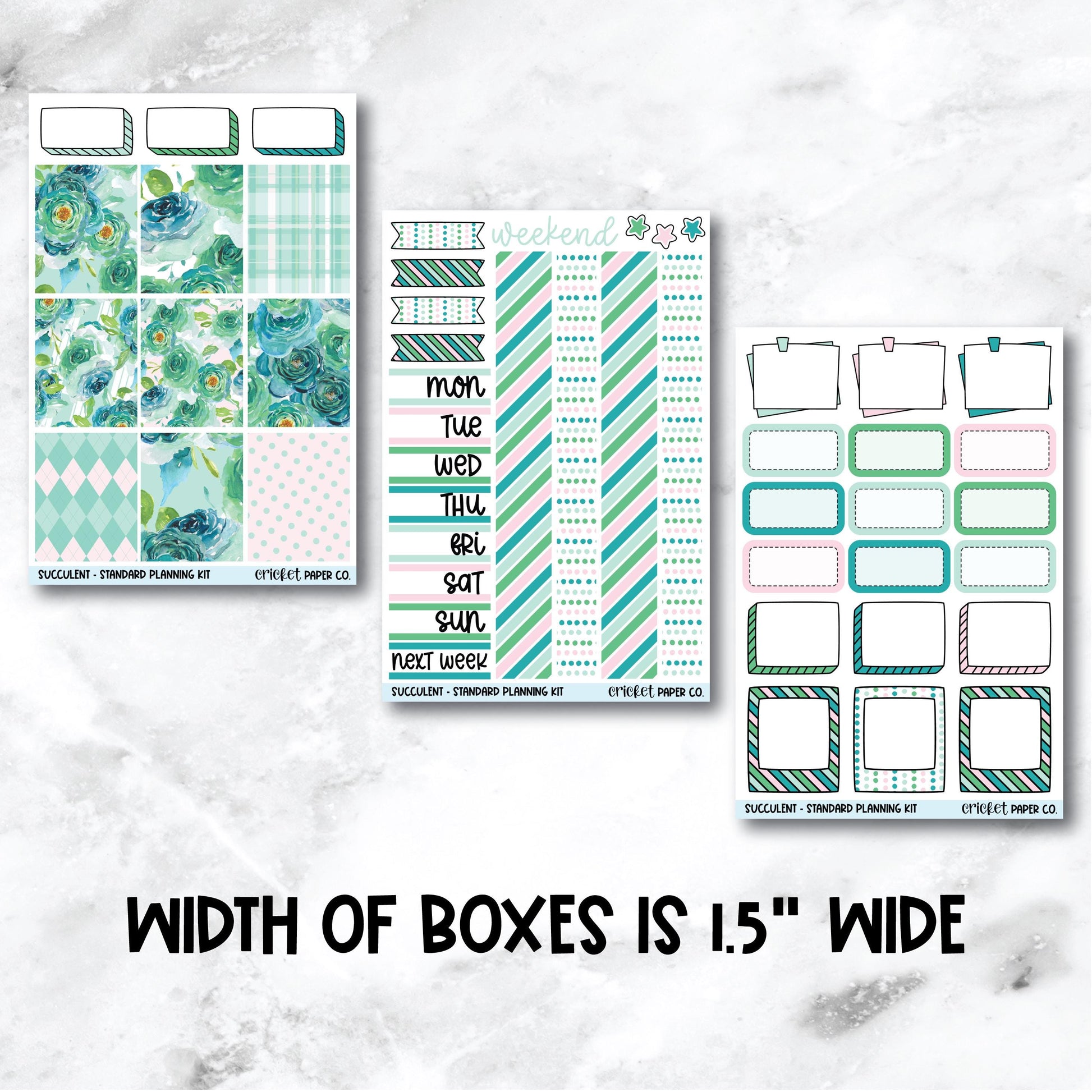 This listing is for a 3 sheet mini kit sized using standard vertical measurements intended for one week of planning. The full boxes are approximately 1.5" wide and 1.9" tall. The date covers and boxes are 1.5" wide. Washi can be hand trimmed to fit whatever spread you need. All stickers are printed on white repositionable matte VINYL. These stickers are kiss cut and ready to use. Just peel and place on your planner where desired. Permanent marker is required to write on the vinyl.