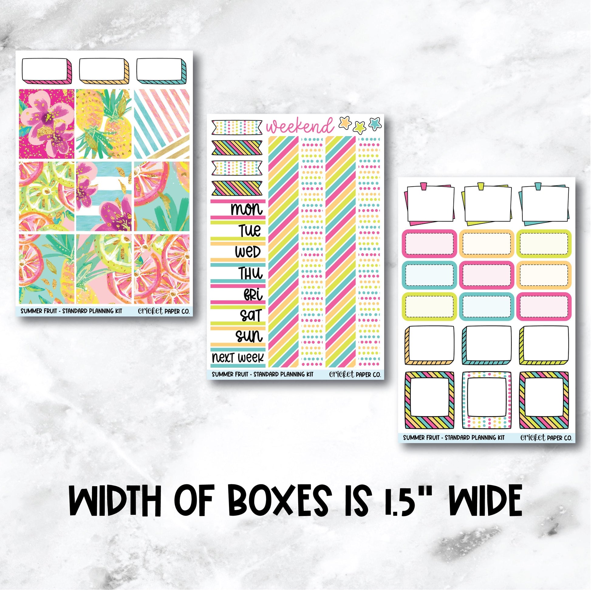 This listing is for a 3 sheet mini kit sized using standard vertical measurements intended for one week of planning. The full boxes are approximately 1.5" wide and 1.9" tall. The date covers and boxes are 1.5" wide. Washi can be hand trimmed to fit whatever spread you need. All stickers are printed on white repositionable matte VINYL. These stickers are kiss cut and ready to use. Just peel and place on your planner where desired. Permanent marker is required to write on the vinyl.