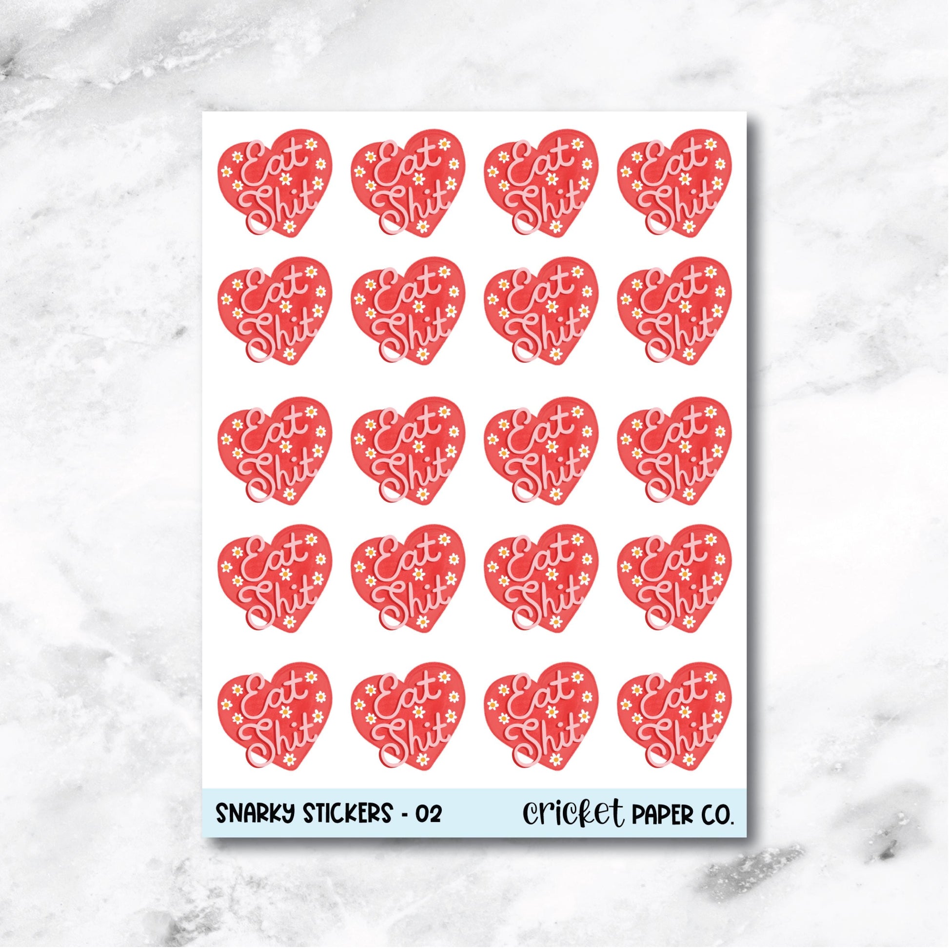 This listing comes with 20 snarky stickers that are perfect for journals and planners. They are approximately 0.85" wide. All stickers are printed on white repositionable matte VINYL. These stickers are kiss cut and ready to use. Just peel and place where desired!