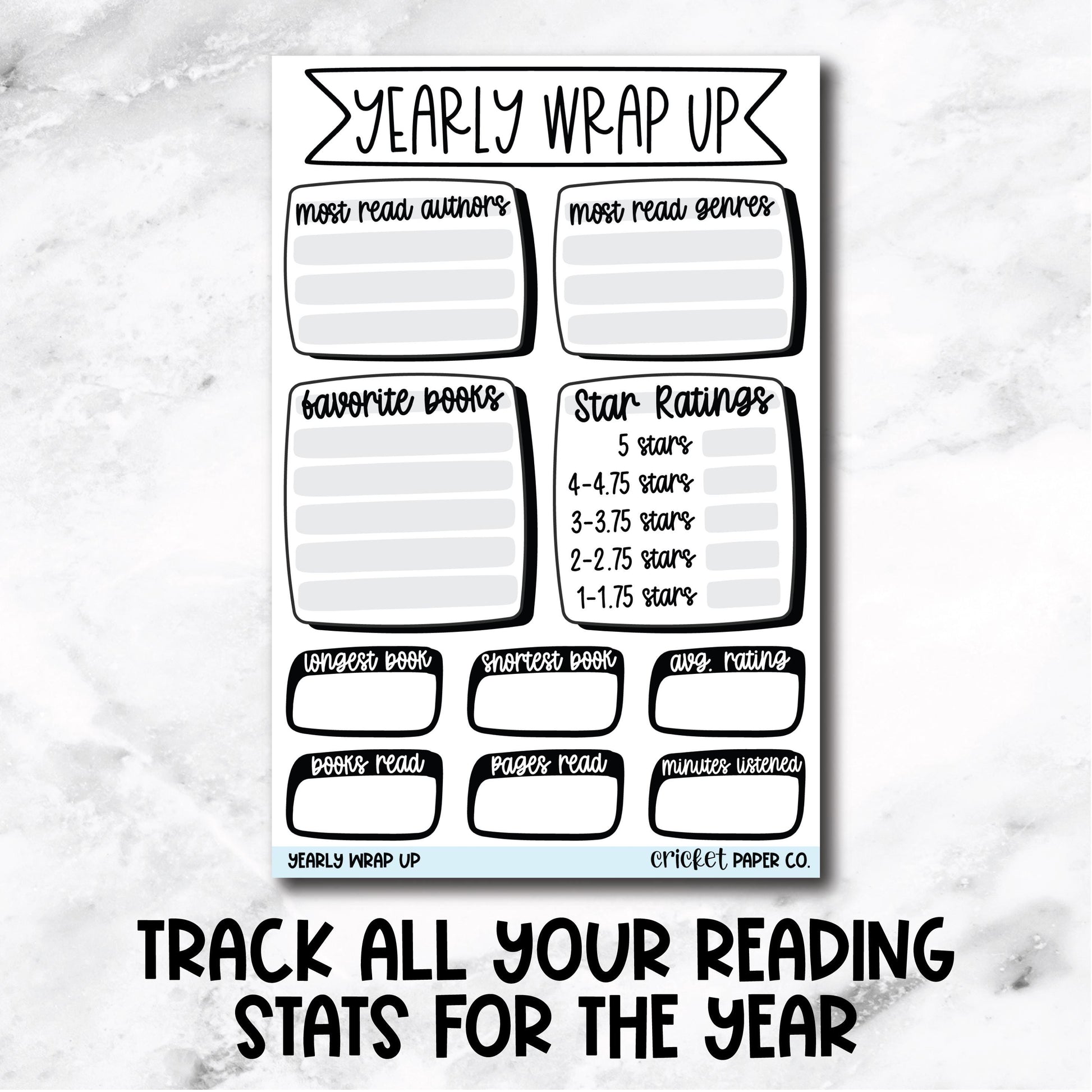 Keep track of your yearly stats and favorites with the Yearly Wrap Up stickers. These are perfect to use in your book journal to track the different formats you read, most read genres, most read authors, favorite books, star rating breakdown and more.